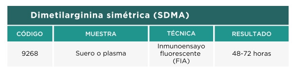 El SDMA es un subproducto del metabolismo de los aminoácidos, eliminado exclusivamente por filtración glomerular. Sus niveles aumentan cuando existe una pérdida del 40 % de la función renal; mientras que la creatinina se eleva recién con un déficit cercano al 75 %.