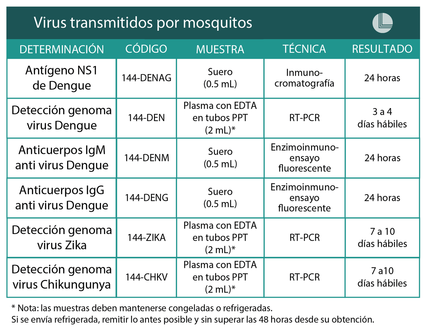Le recordamos que si desea solicitar el análisis de marcadores de laboratorio, para el diagnóstico de virus transmitidos por mosquitos (como dengue, zika y chikungunya), deberá completar la ficha epidemiológica con información clínica/epidemiológica relevante del paciente, y sus datos de contacto.