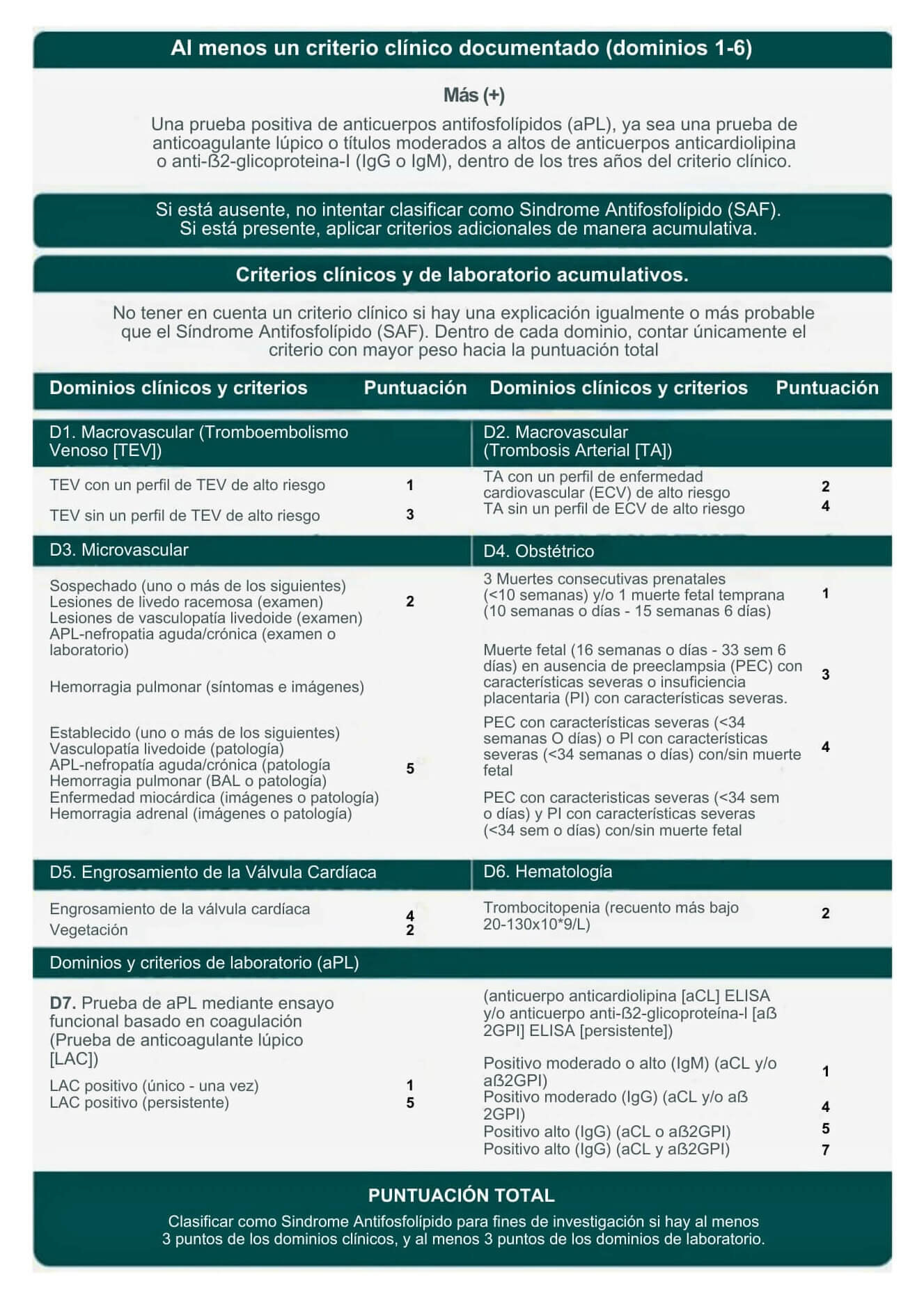 Como criterio de entrada, se estableció al menos una prueba positiva para aFLs (en el periodo de 3 años después de un criterio clínico), seguido de otros criterios agrupados en 6 dominios clínicos: 1) tromboembolismo venoso, 2) arterial macrovascular, 3) arterial microvascular 4) obstétrico, 5) válvula cardíaca y 6) hematológico; y 2 dominios de laboratorio: determinación de AL y ensayos de fase sólida para anticuerpos aB2GPI y aCL. Se clasifica como SAF al paciente que tiene al menos 3 puntos en los dominios clínicos y 3 puntos en los dominios de laboratorio.