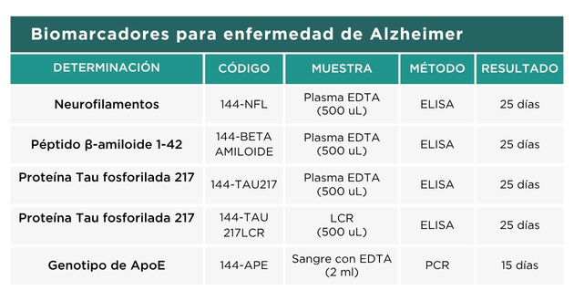 Varios autores demostraron que altos niveles de neurofilamentos plasmáticos son indicadores de neurodegeneración activa en algunos trastornos neurodegenerativos, entre ellos la EA. Además, la apolipoproteína E (APOE) es un biomarcador genético sanguíneo, y el genotipo APOE ε4 representa un factor de riesgo para la EA. Una de las condiciones que puede elevar la progresión a EA sintomática es el estado de portador del gen APOE ε4, siendo los homocigotos APOE ε4 un riesgo muy alto para desarrollar EA clínica. Por lo tanto, la presencia de APOE ε4 en un individuo con síntomas compatibles con EA respalda la probable aparición de patología amiloide.