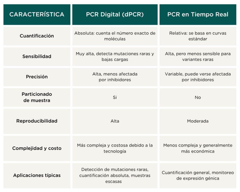 Para resumir, podemos observar las diferencias más importantes entre dPCR y una qPCR: