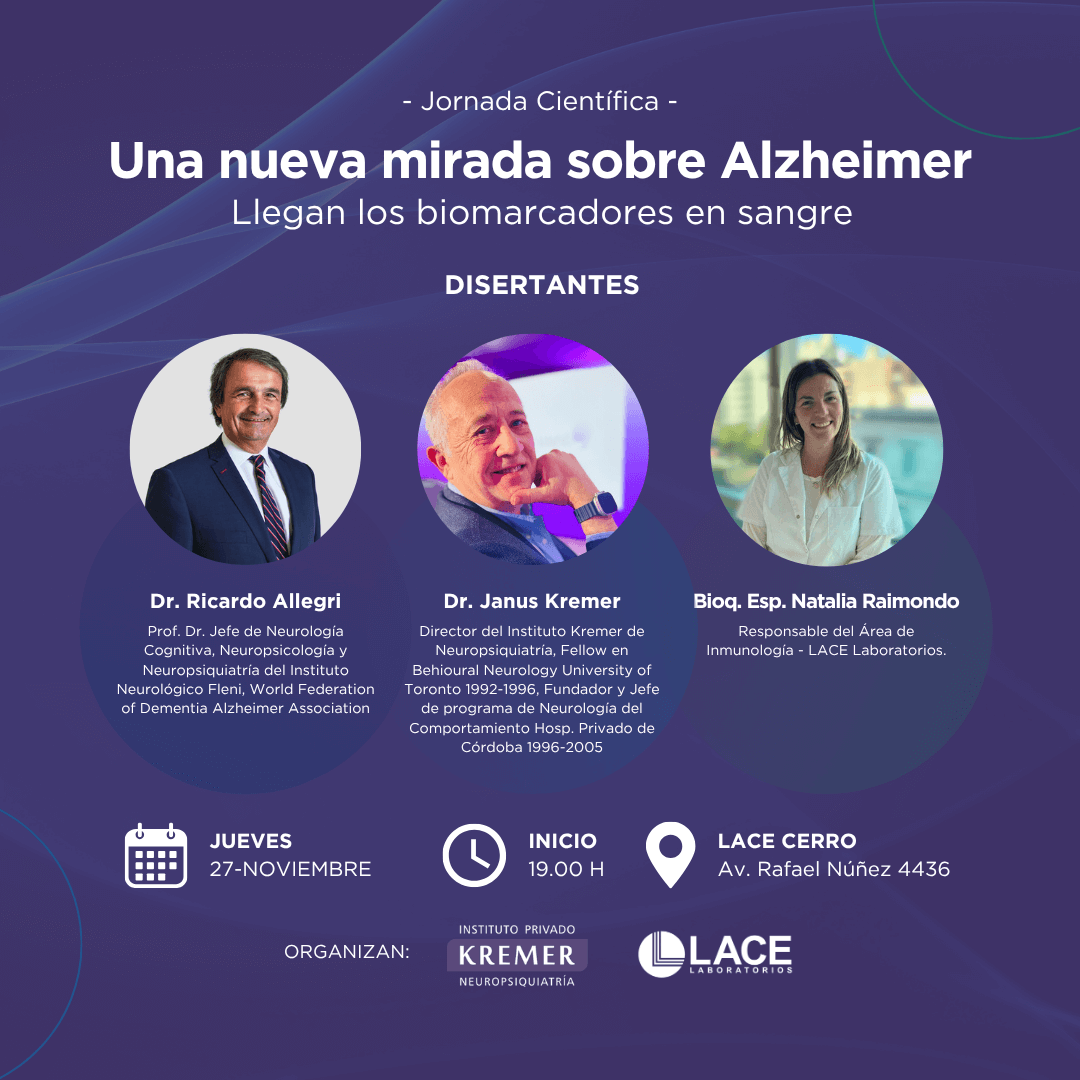 Con el objetivo de promover la actualización continua de profesionales de la salud, LACE Laboratorios y el Instituto Privado Kremer organizan una jornada dedicada al rol de los biomarcadores sanguíneos, en el diagnóstico precoz de la enfermedad de Alzheimer, a cargo de reconocidos especialistas en neurología e inmunología clínica.